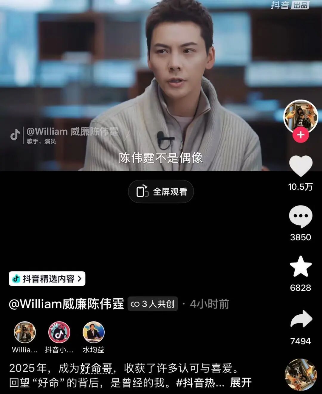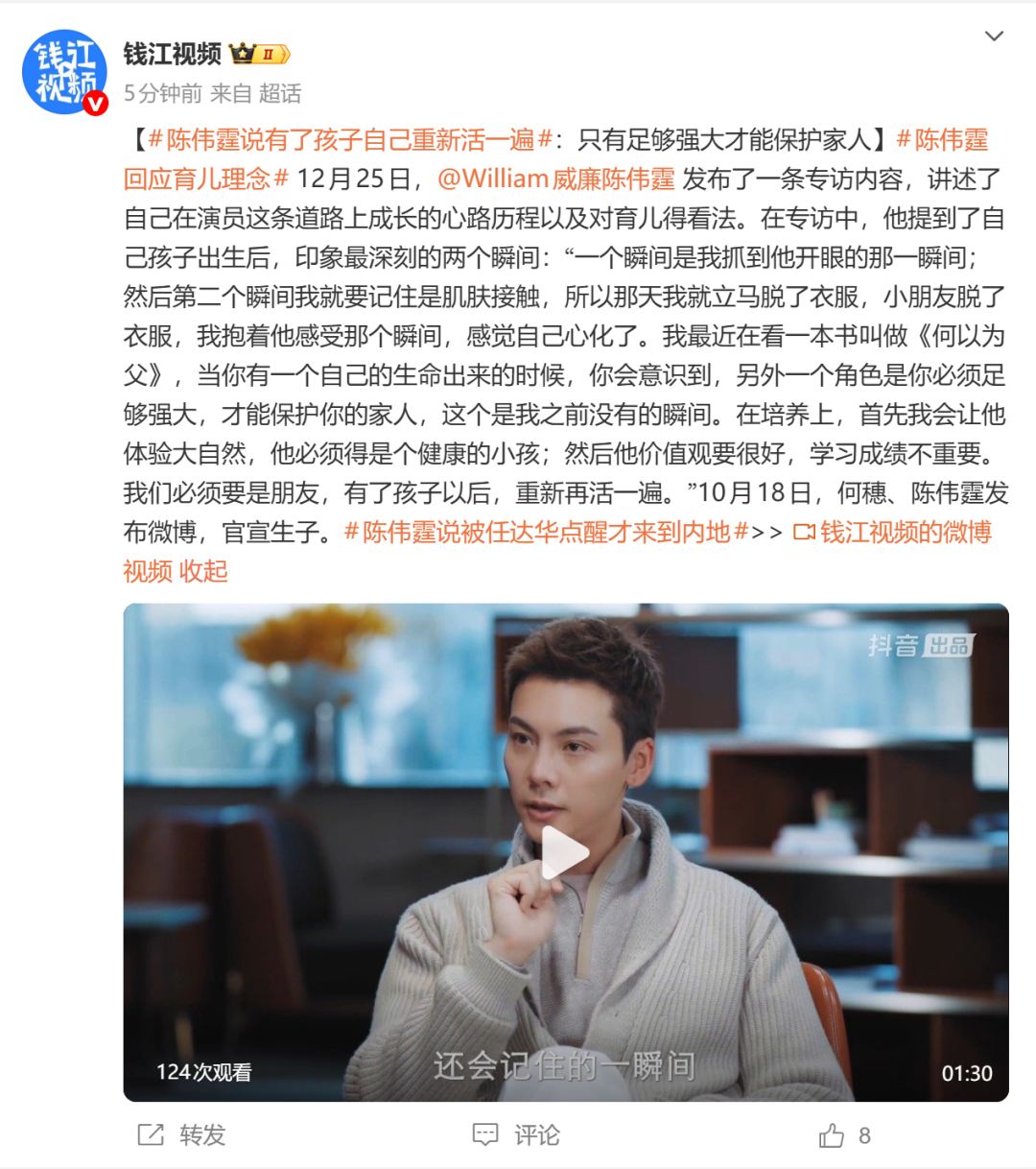 12月25日,陈伟霆发布了一条水均益专访内容,讲述了自己在演员这条道路上成长的心路历程以及对育儿的看法。